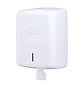 Dispensador de papel mecha fabricado con material ABS blanco de alta calidad y resistencia. Tiene una capacidad para una bobina máximo de 205 mm de diámetro apoyada en su lateral y sin mandril.