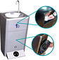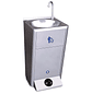 Lavamanos portátil Hidráulico está fabricado en acero inoxidable AISI 304. Su funcionamiento es totalmente independiente de la instalación eléctrica, tomas de agua y de la electricidad. Dispone de dos depósitos de agua con una capacidad de 11 litros, uno para agua sucia y otro para agua limpia. El botón hidráulico accionado con el pie bombea agua limpia a 1 litro por minuto.